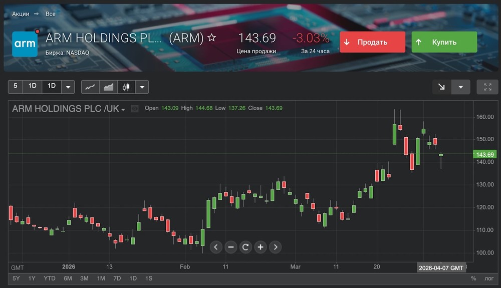 На этом фоне акции многих технологических компаний показали значительный рост. Например, акции Intel торгуются на уровне 52,71 доллара, показав рост на 21,16% за март 2026 года. Компания активно наращивает производство чипов и инвестирует в развитие собственных фабрик, чтобы конкурировать с лидерами рынка. ARM Holdings, чьи акции достигли 143,69 доллара (+25,76%), выигрывает от своей бизнес-модели лицензирования архитектур. Практически все современные мобильные устройства и значительная часть серверных решений используют технологии ARM, что делает компанию ключевым игроком в экосистеме. Т.е если бы вы вложили 1000 долларов в бумаги ARM, то за последний месяц смогли бы получить более 250 долларов прибыли.